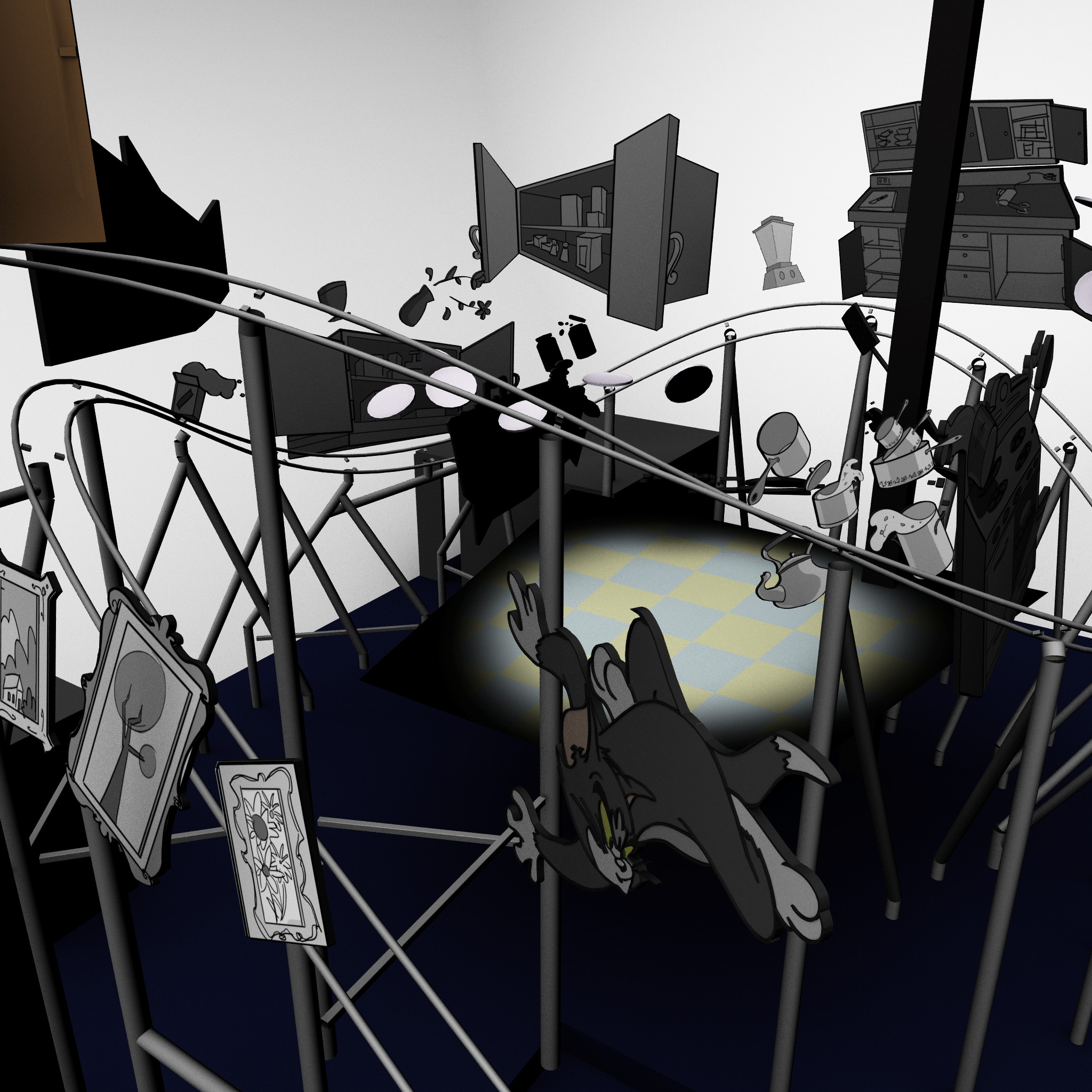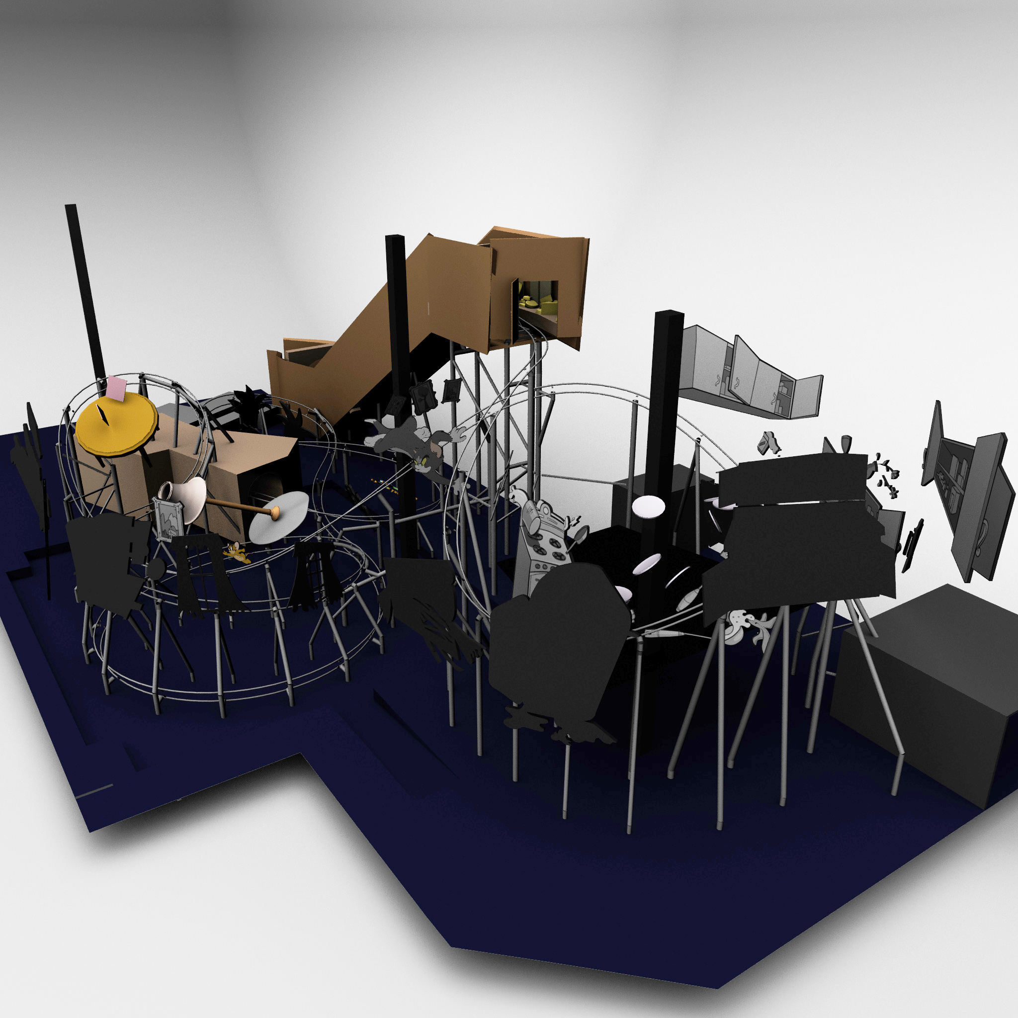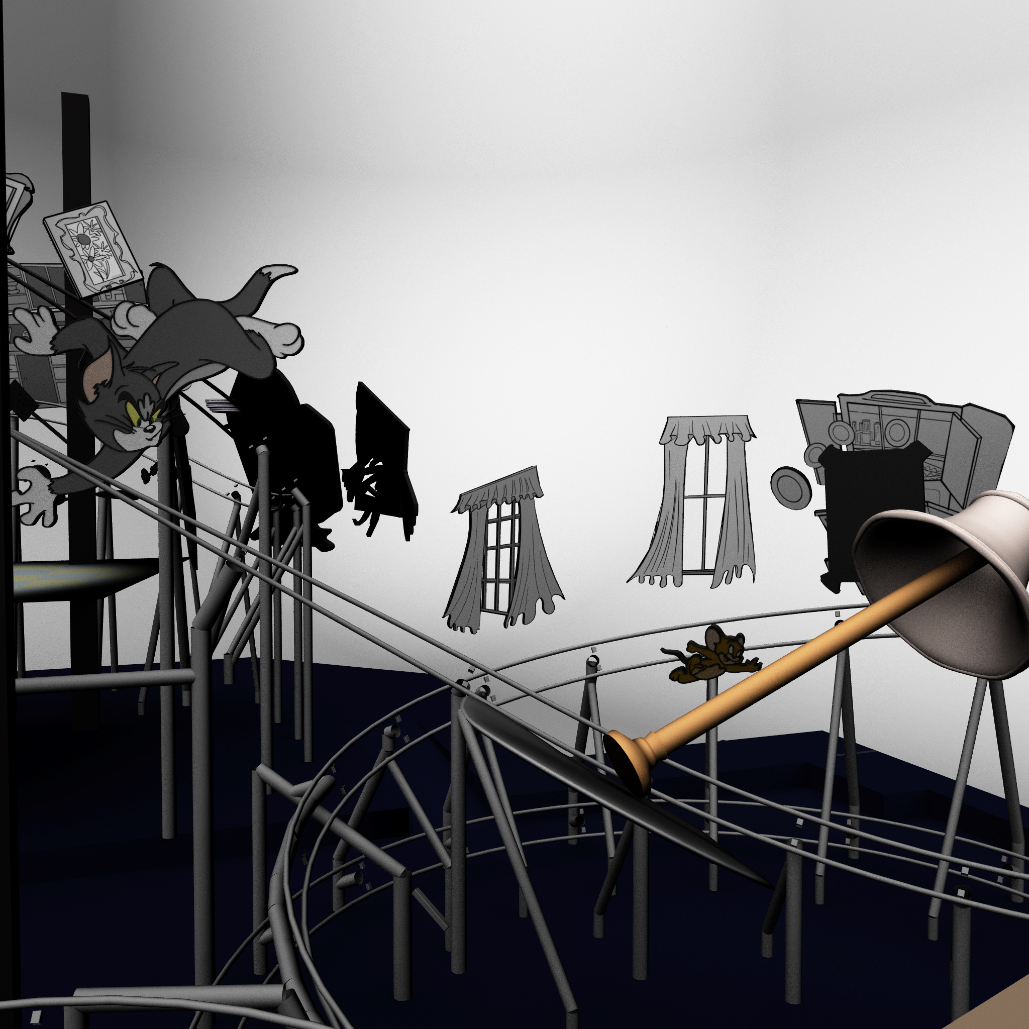 While at Thinkwell, I was a part of the team responsible for creating and developing designs for the Cartoon Junction. We worked on the Tom and Jerry attraction, which is an indoor roller coaster. I worked with the technical department over the Reach Envelope study, and object/prop placement.