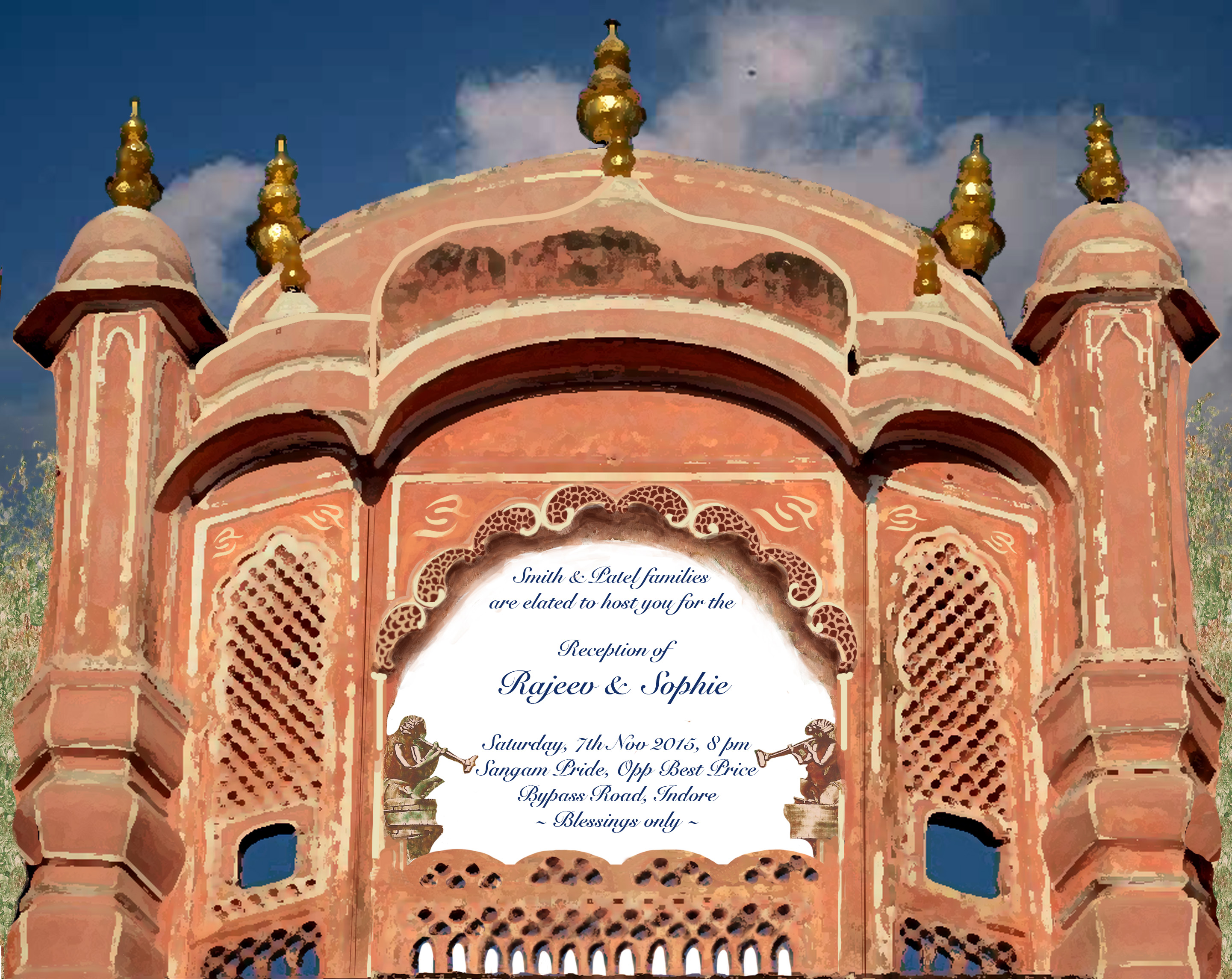 To start off, I designed their wedding invitation keeping in mind the wedding theme, based around a painting done by their close family member.